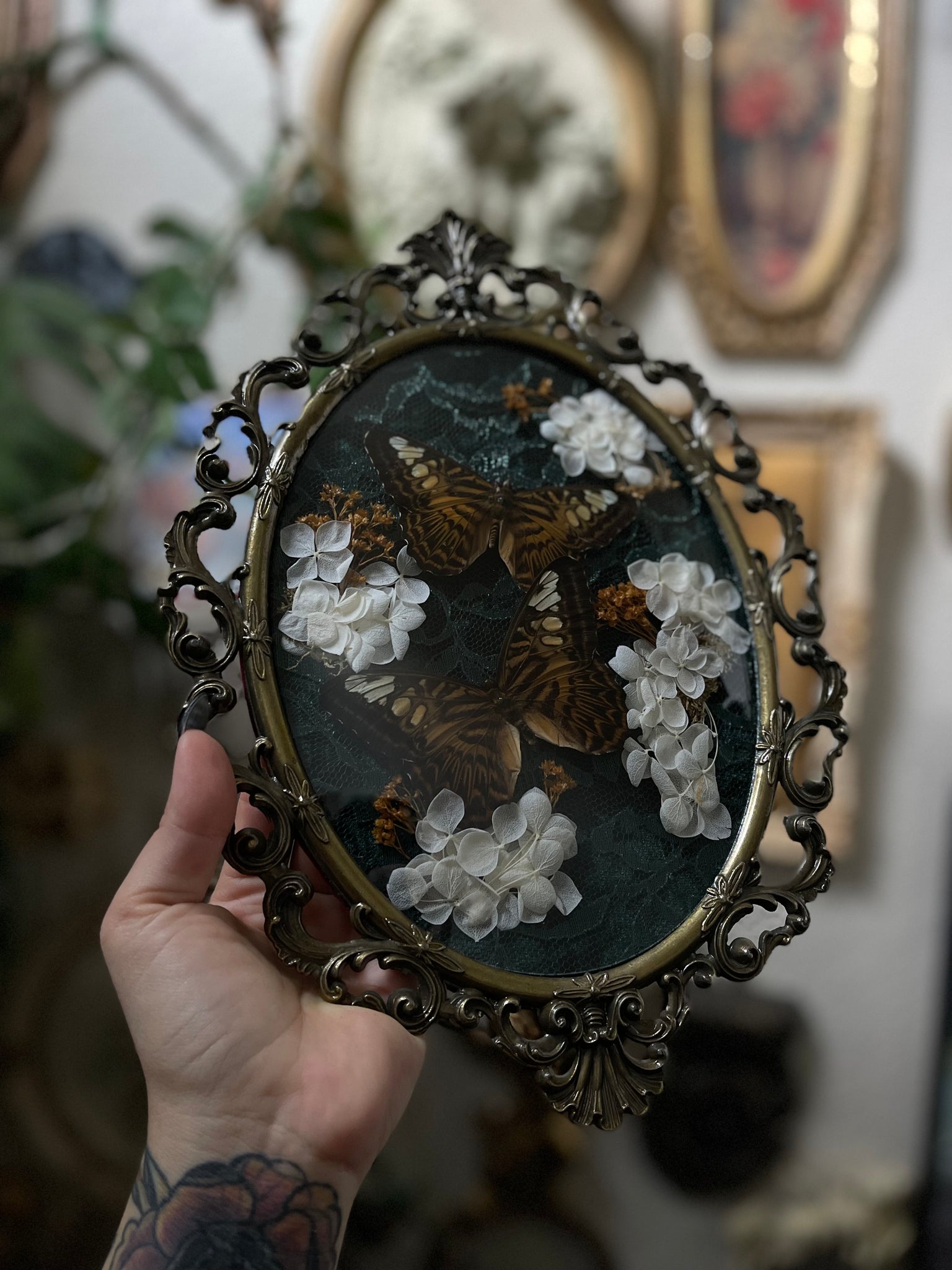 Two clipper butterflies sit in a unique vintage frame with beige and white floral detailing with a green lace background.