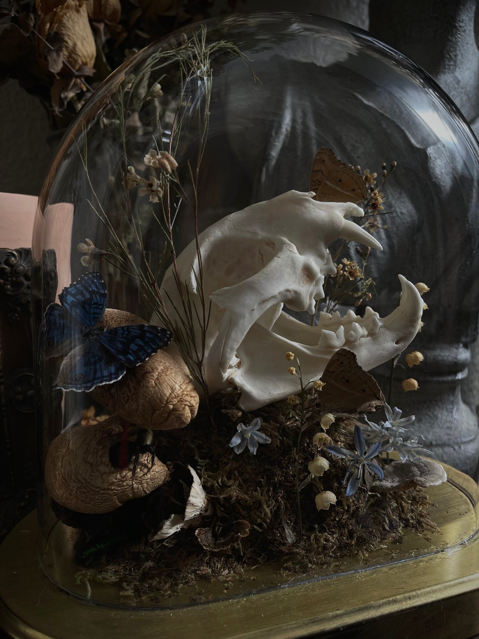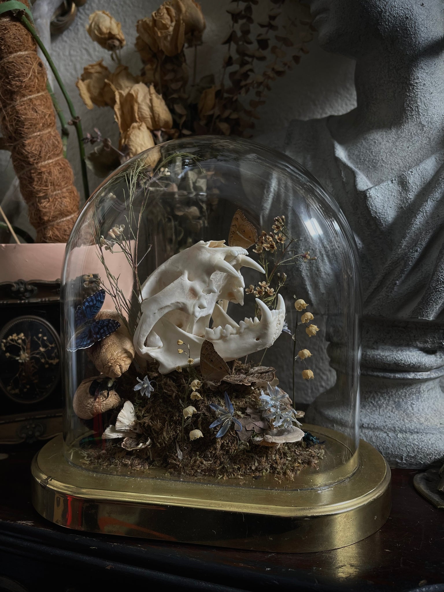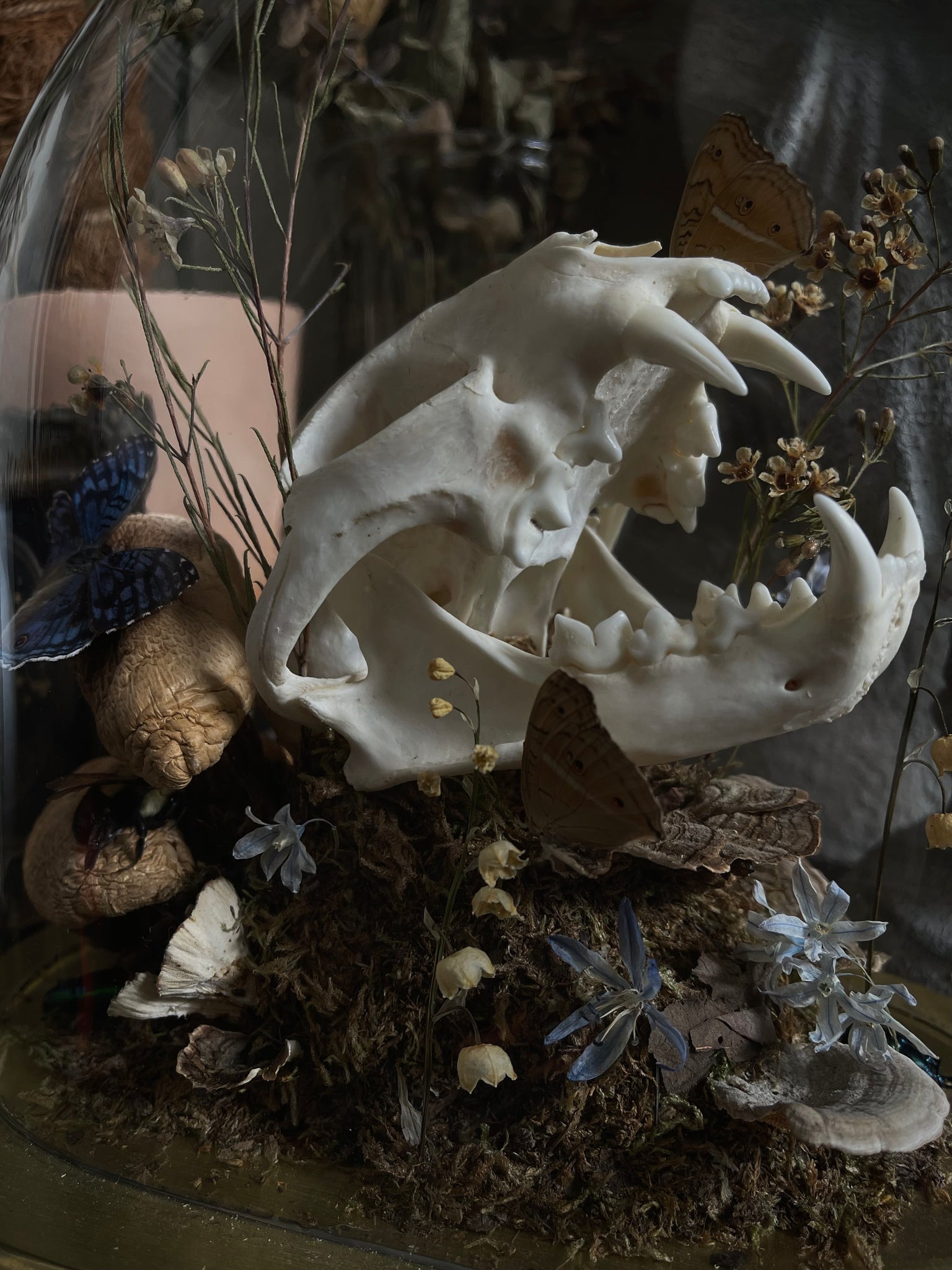 A bobcat skull rests on a bed of mosses, surrounded by hand dried florals and mushrooms. Cloche measures 4.5” wide, 10” long, and 9” tall.
