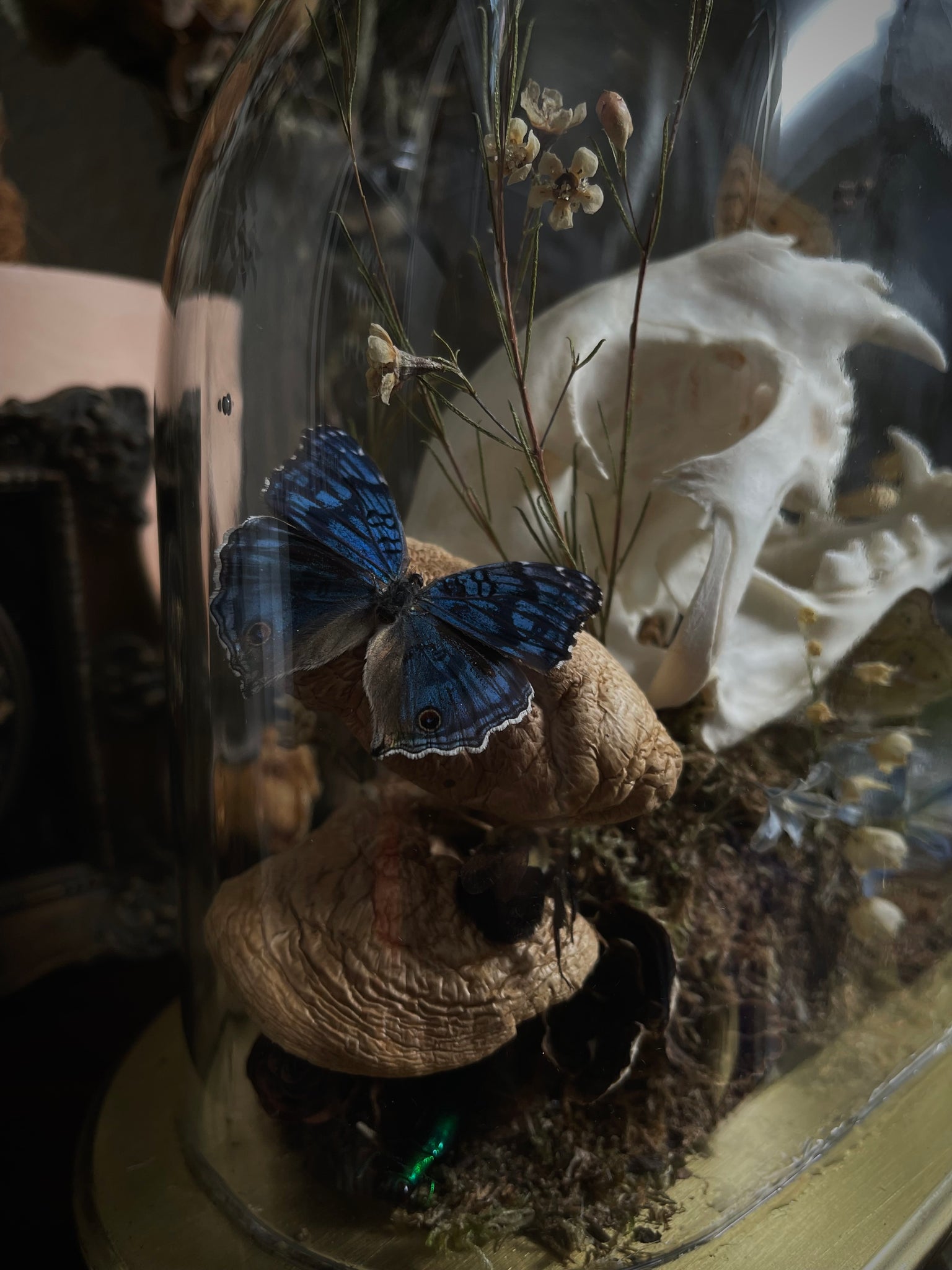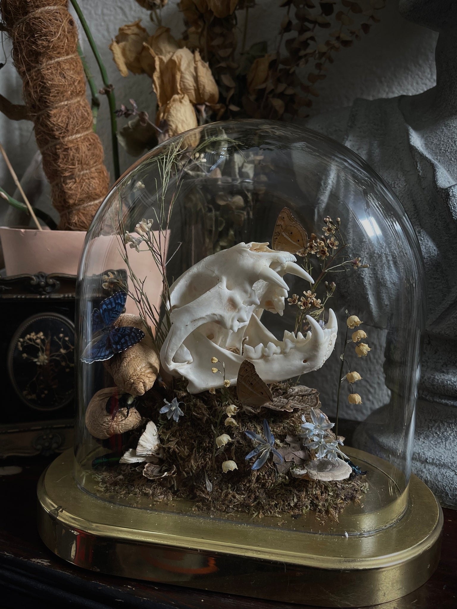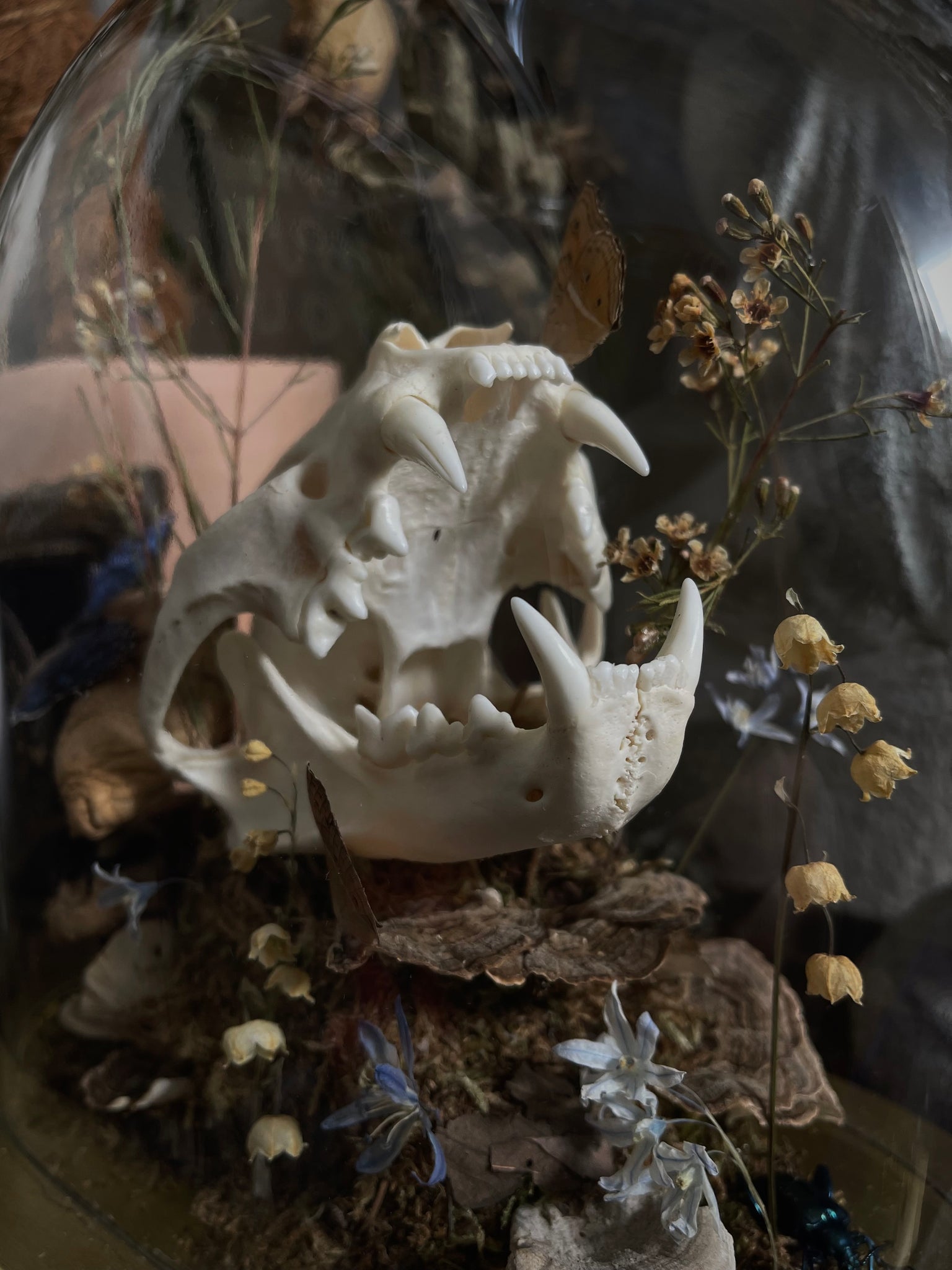 A bobcat skull rests on a bed of mosses, surrounded by hand dried florals and mushrooms. Cloche measures 4.5” wide, 10” long, and 9” tall.