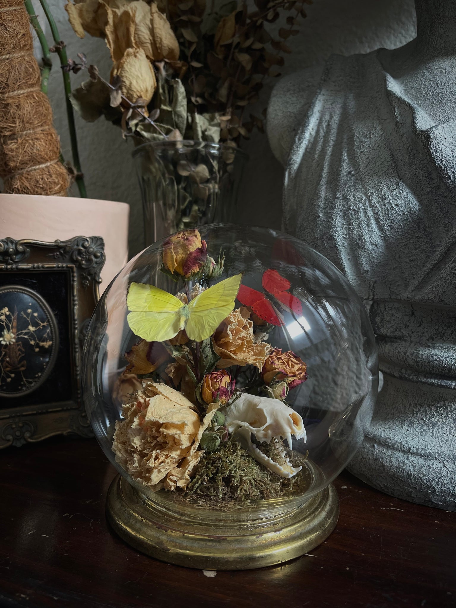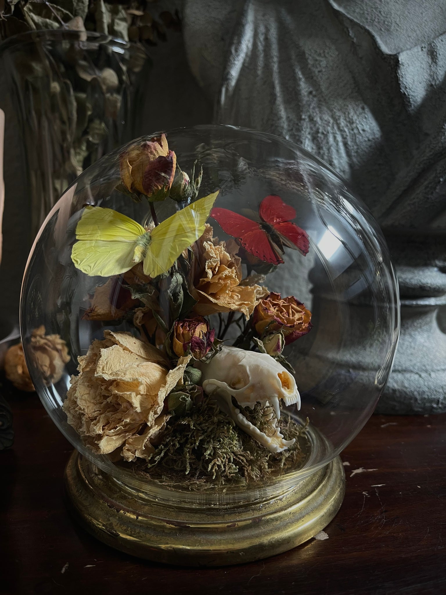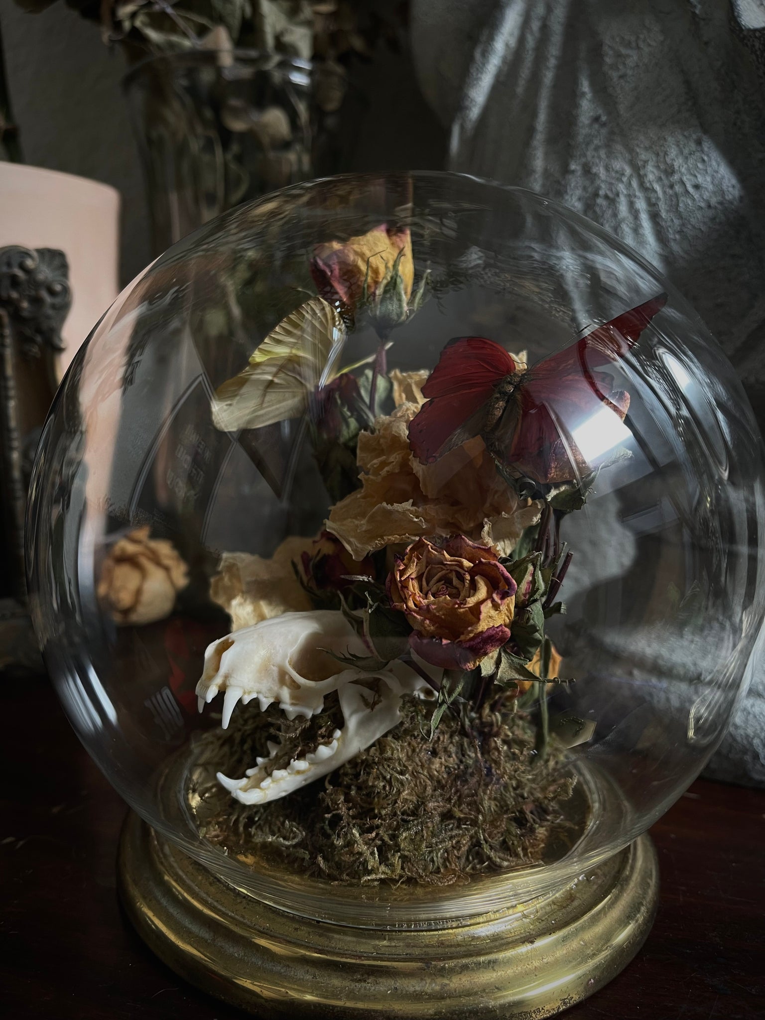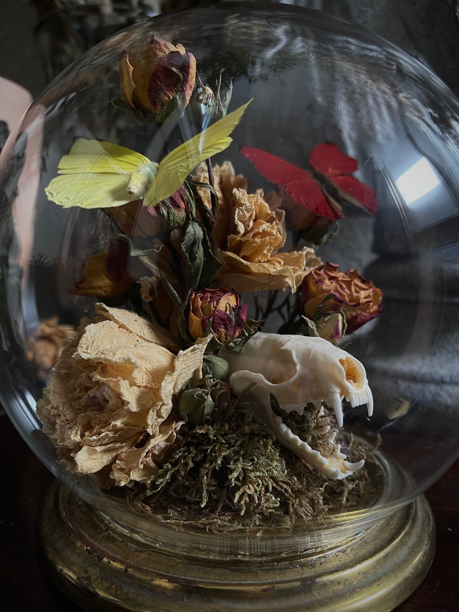 A mink skull and its butterfly friends dance around hand dried roses in a 7” tall, 5” diameter cloche.