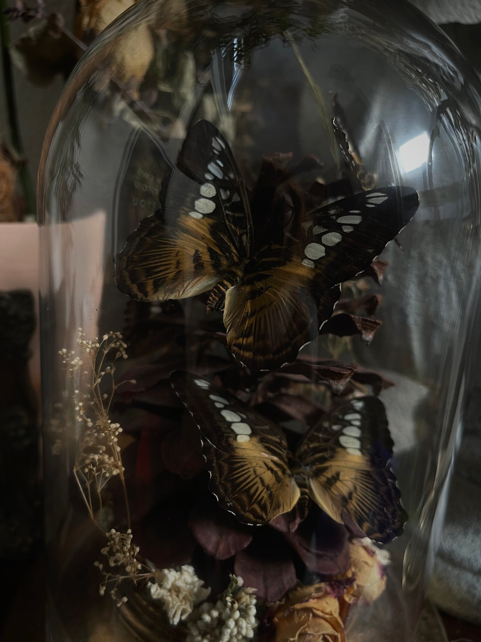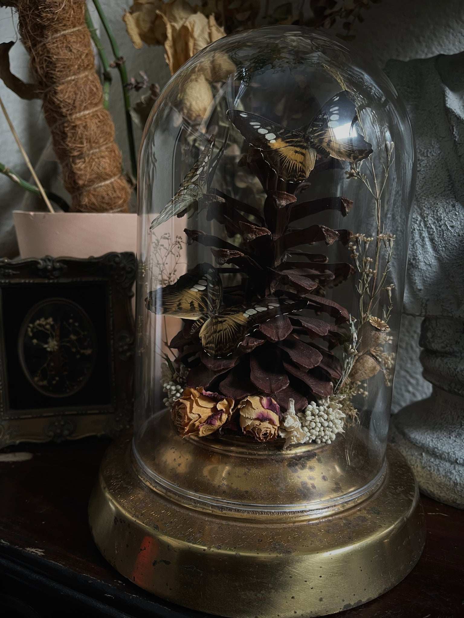 Parthenos sylvia butterflies sit a glass cloche with dried flowers and a large pinecone! Cloche measures 10” tall and 8” in diameter.